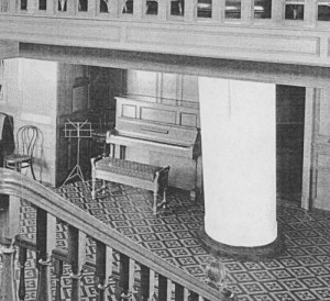 It would have been impossible for the quintet to perform in certain rooms because of the absence of pianos. As the pianos were bolted to the floor, immobile, and as the quintet’s music arrangements called for piano (and ensemble musicians played exclusively from arrangements, not from memory), this ensemble was limited to performing only in areas where a piano was available.